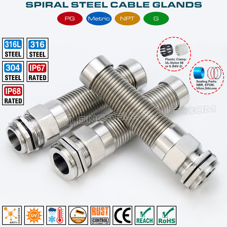 I pressacavi passacavi flessibili in acciaio inox (noti anche come pressacavi spiralati in acciaio inox) sono componenti protettivi utilizzati per il collegamento tra cavi e apparecchiature. Le loro caratteristiche principali includono la prevenzione di flessioni eccessive del cavo, la tenuta stagna e la realizzazione in acciaio inox. Utilizzano una speciale molla o struttura flessibile per ammortizzare e distribuire le sollecitazioni sul cavo in uscita, garantendo al contempo la tenuta e la stabilità del collegamento. Sono costituiti da un corpo in acciaio inox, una protezione a spirale, una guarnizione, un inserto in plastica, un o-ring e un controdado.